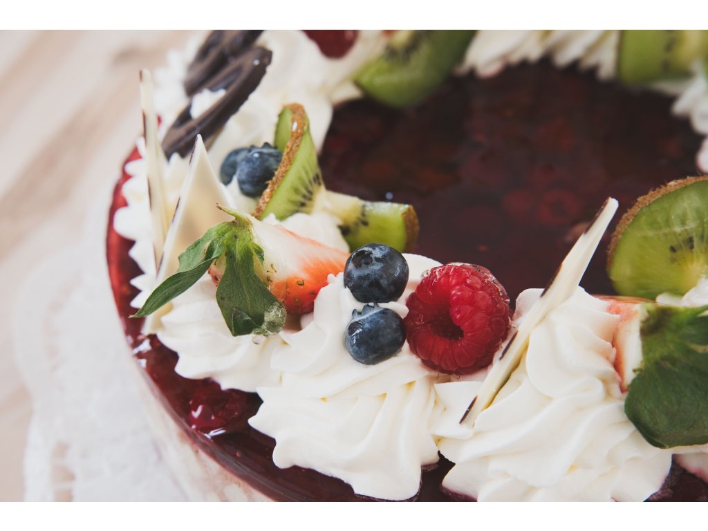 Kombinace barevného a světle hnědého korpusu s čokoládovým krémem přelitý želé s malinami